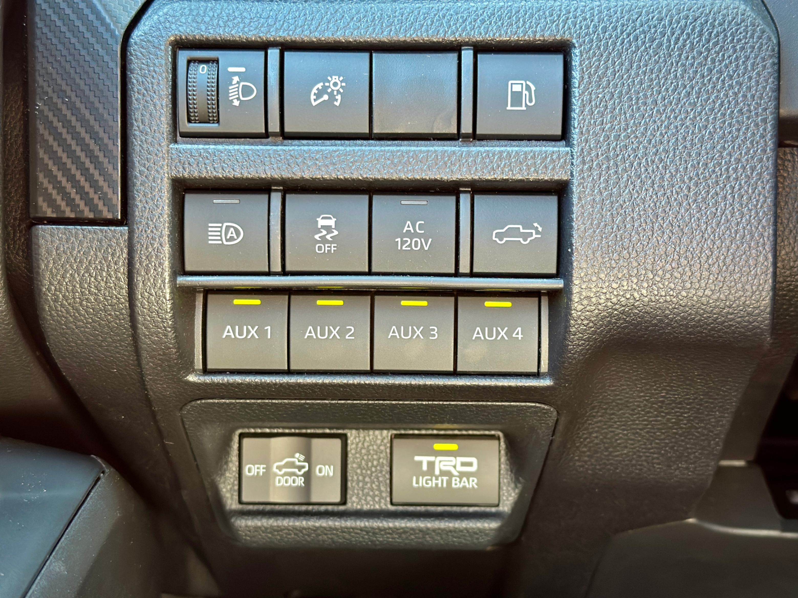 326匹i-FORCE MAX 2.4T混动,8AT,分时四驱,后差速锁,电控前可断防倾杆,多地形选择模式,蠕行模式,全套FOX高强度减震带快捷三种阻尼可调,TRD高性能进气与排气声浪。红黑SofTex耐磨易清洗皮质内饰,加热通风前排座椅与加热方向盘,IsoDynamic动态减震前排座椅带可调阻尼。14寸大触屏与12.3寸液晶仪表盘,导航,无线CarPlay与安卓Auto,JBL高级音响系统带可移动无线中置小音箱,无线手机充电,全地形监控系统与多角度摄像头,电子流媒体后视镜。全LED大灯,Rigid雾灯,高亮度LED前射灯,ARB钢制后保险杠带拖钩,电动后斗尾门。TOYOTA SAFETY SENSE 3.0主动安全防护系统。等等丰富好玩的配置!